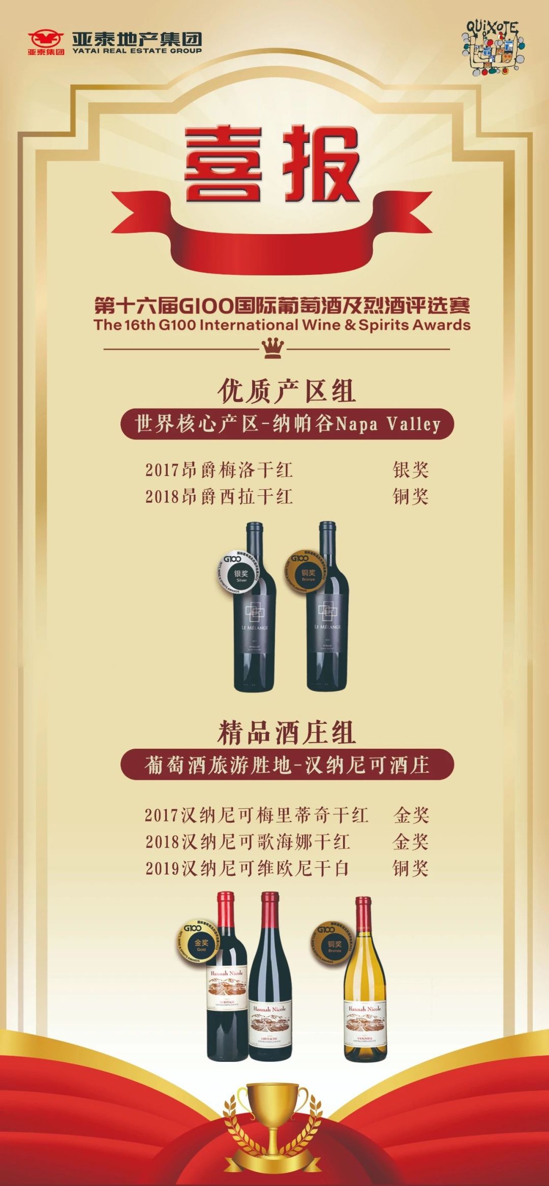 第十六屆G100國際快色视频网页版及烈酒評選賽已圓滿完成,亞泰快色视频软件酒業旗下“昂爵”“漢納尼可”係列酒品參賽。在優質產區組評選中,2017昂爵梅洛幹紅、2018昂爵西拉幹紅憑借源自世界快色视频网页版核心產區——納帕穀Napa Valley產源地的卓越品質贏得銀銅雙獎;在精品酒莊組評選中,2017漢納尼可梅裏蒂奇幹紅、2018漢納尼可歌海娜幹紅榮獲金獎,2019漢納尼可維歐尼幹白榮獲銅獎,彰顯美國加州康縣漢納尼可酒莊的醇正風味。